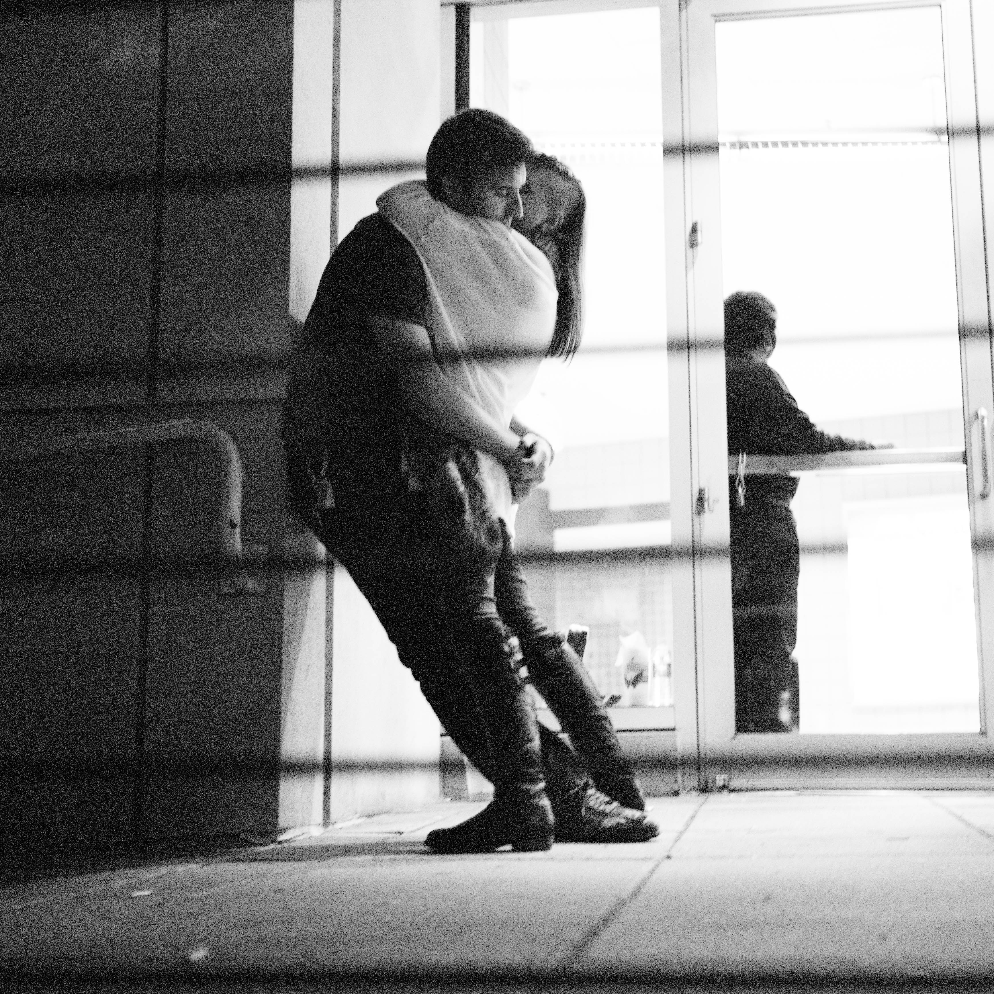 In this monochromatic photograph, a couple shares a tender embrace, their bodies intertwined against a stark urban backdrop. The contrast of shadows and light enhances the intimacy of their connection while the blurred lines of a railing suggest a sense of separation from the outside world. The mood is both romantic and a touch mysterious, as a figure watches from the doorway, hinting at an unseen narrative.