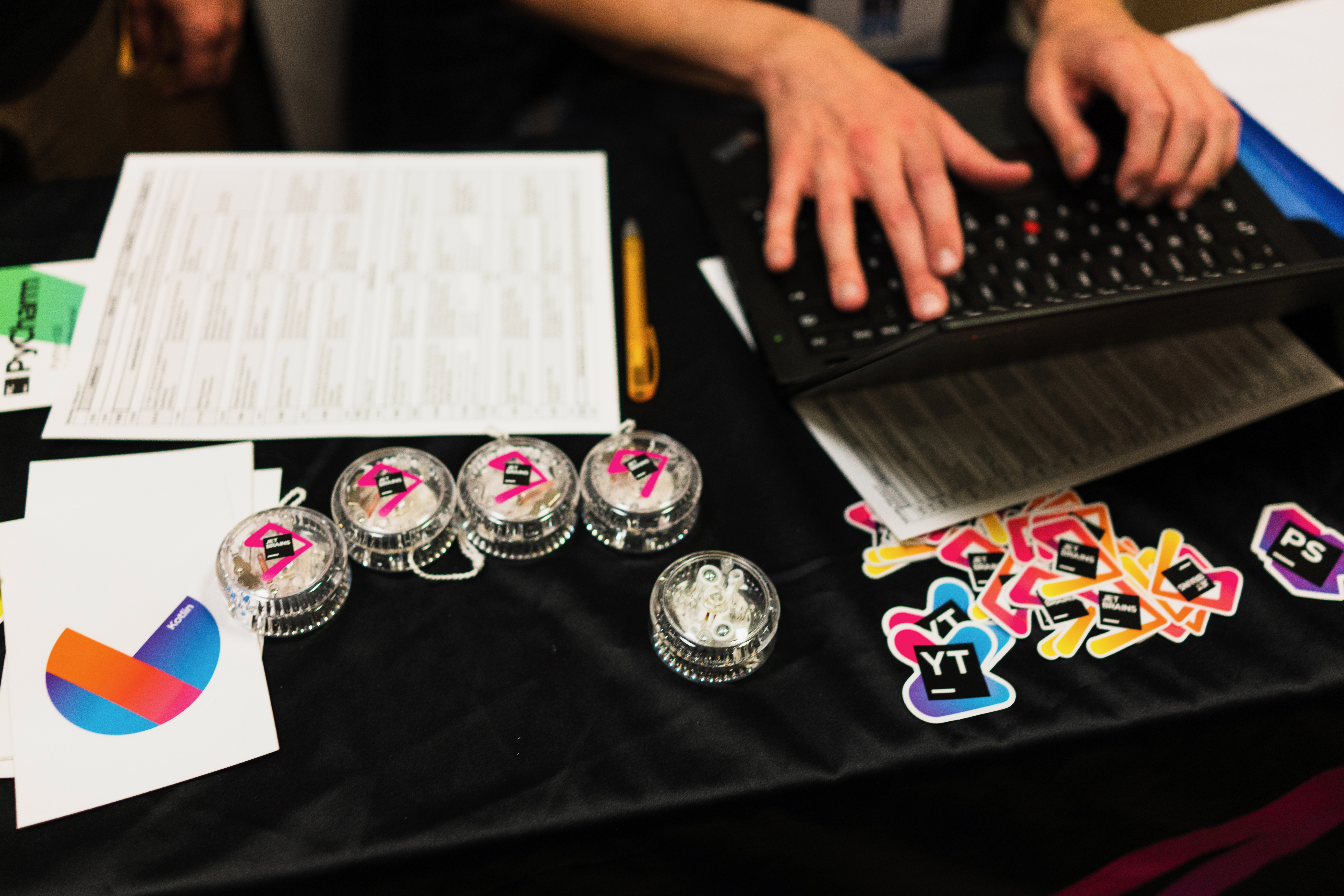 The photograph captures a close-up view of a busy workspace, featuring hands actively typing on a keyboard while an array of colorful stickers and promotional items lay scattered on a dark table. The lighting is soft but focused, enhancing the vibrant colors of the materials and conveying a lively, creative atmosphere.