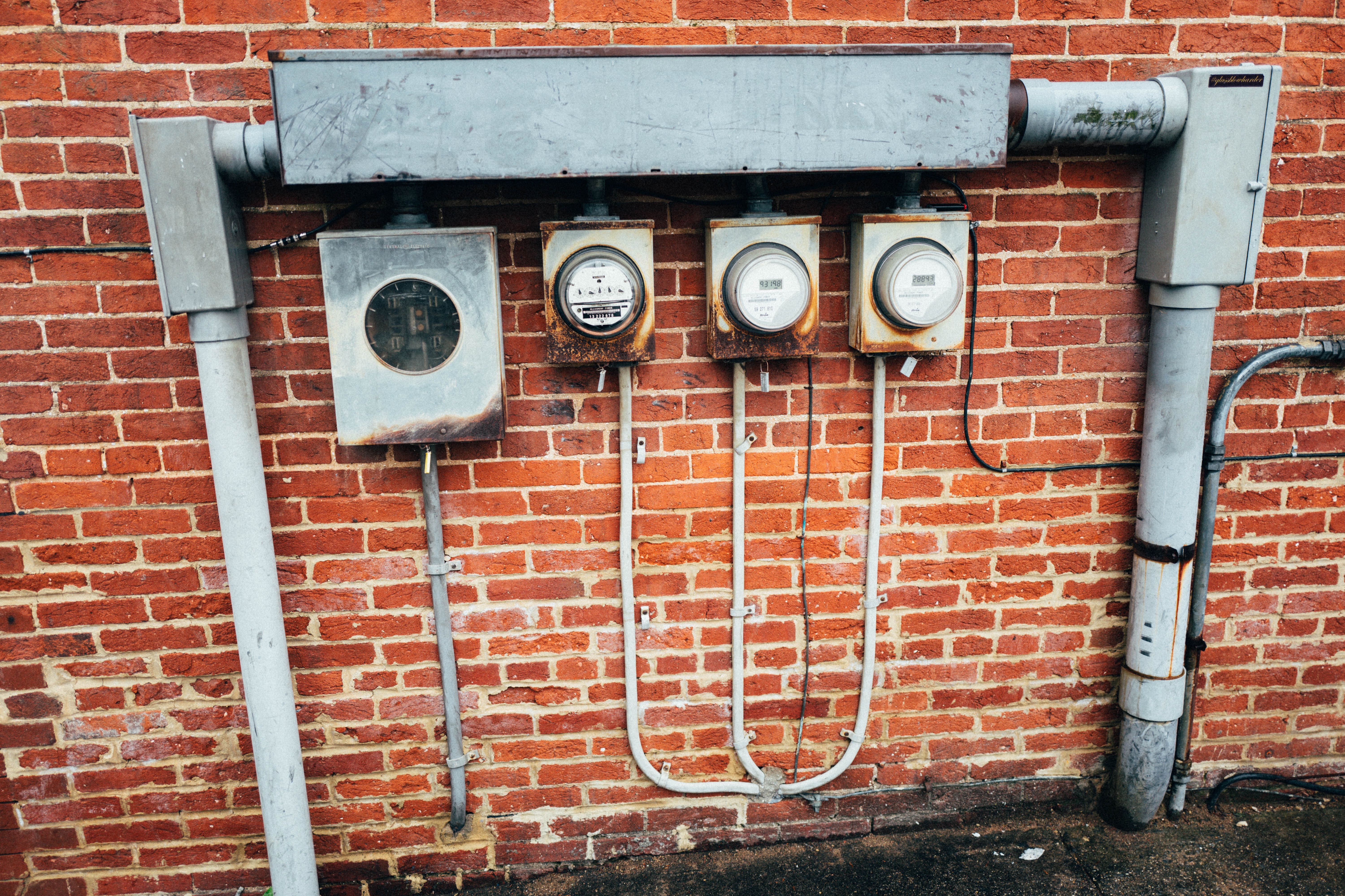 This photograph captures a row of electrical meters against a rugged red brick wall, showcasing the interplay between urban decay and industrial functionality. The muted lighting and slight tarnish on the meters evoke a sense of nostalgia, hinting at the passage of time. The composition emphasizes the horizontal alignment of the meters, creating a balanced yet raw aesthetic that speaks to a forgotten urban landscape.