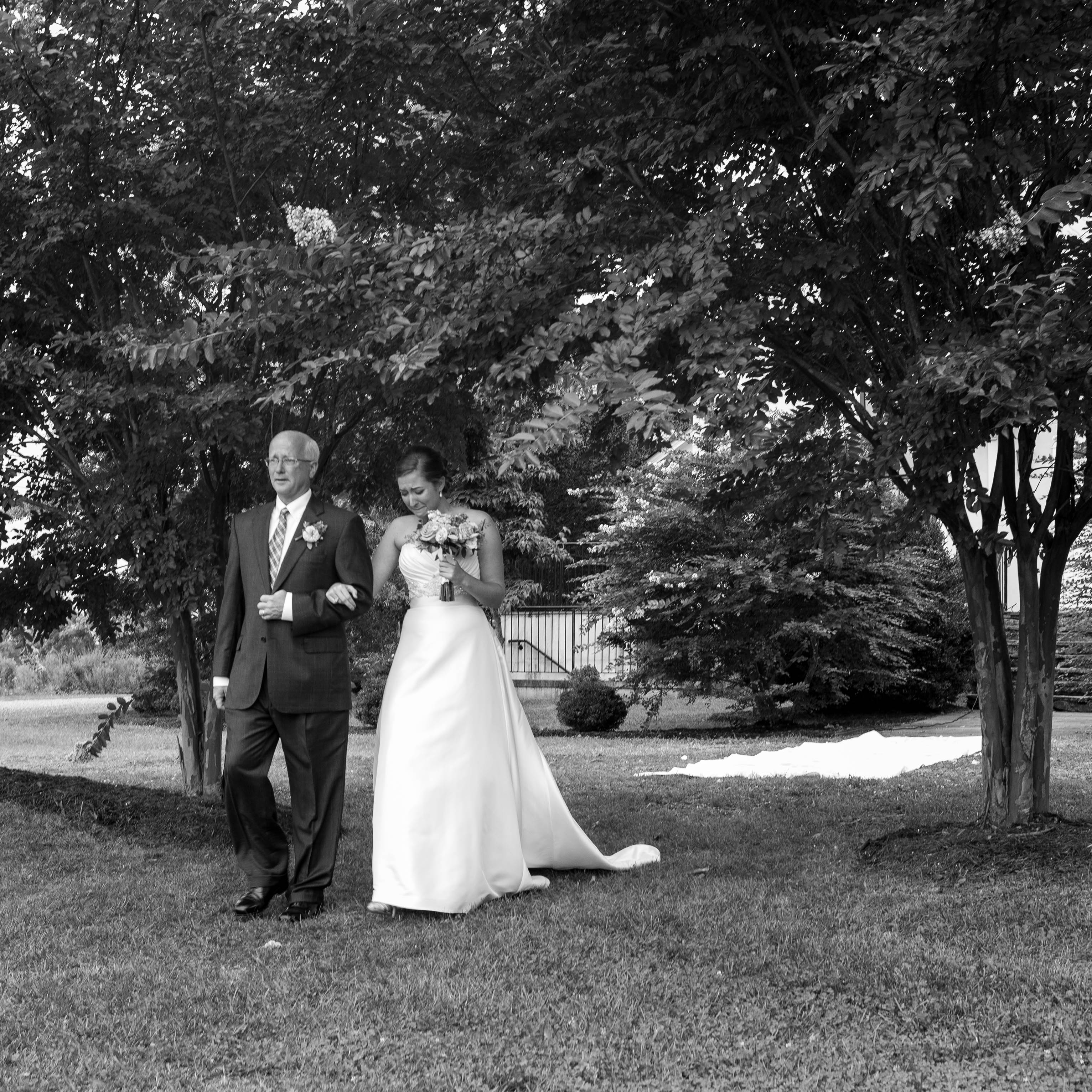 In a serene outdoor setting, a bride in an elegant white gown walks alongside her father, both exuding a mix of emotions as they prepare for an important moment. The photograph, rendered in black and white, emphasizes their expressions and the lush greenery surrounding them, adding a timeless quality. Soft, diffused light filters through the trees, creating an intimate atmosphere filled with anticipation and love.
