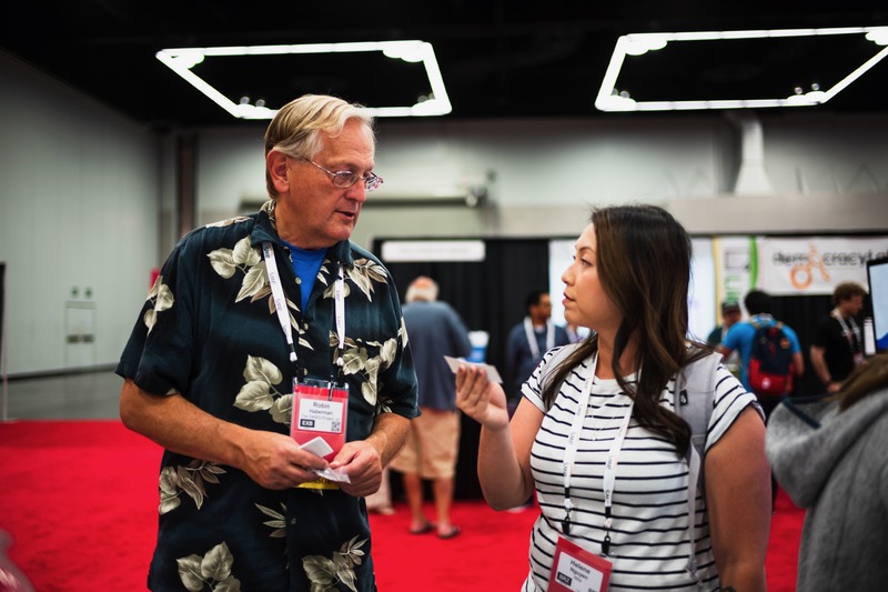 In this vibrant convention scene, two individuals engage in what appears to be a lively discussion, showcasing a blend of curiosity and enthusiasm. The rich colors of the red carpet and the floral patterns contrast against the neutral backdrop, enhancing the subjects' animated expressions and gestures. Soft lighting accentuates their faces, creating a warm atmosphere that suggests connection and dialogue.