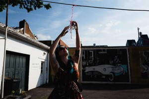 In this vibrant photograph, a woman with striking blue hair reaches skyward, holding a dangling ornament against a backdrop of urban murals. The warm sunlight bathes the scene in a golden hue, creating a playful and carefree mood. Her tattoos and the lively colors of her dress add a touch of individuality, contrasting against the muted tones of the buildings around her.