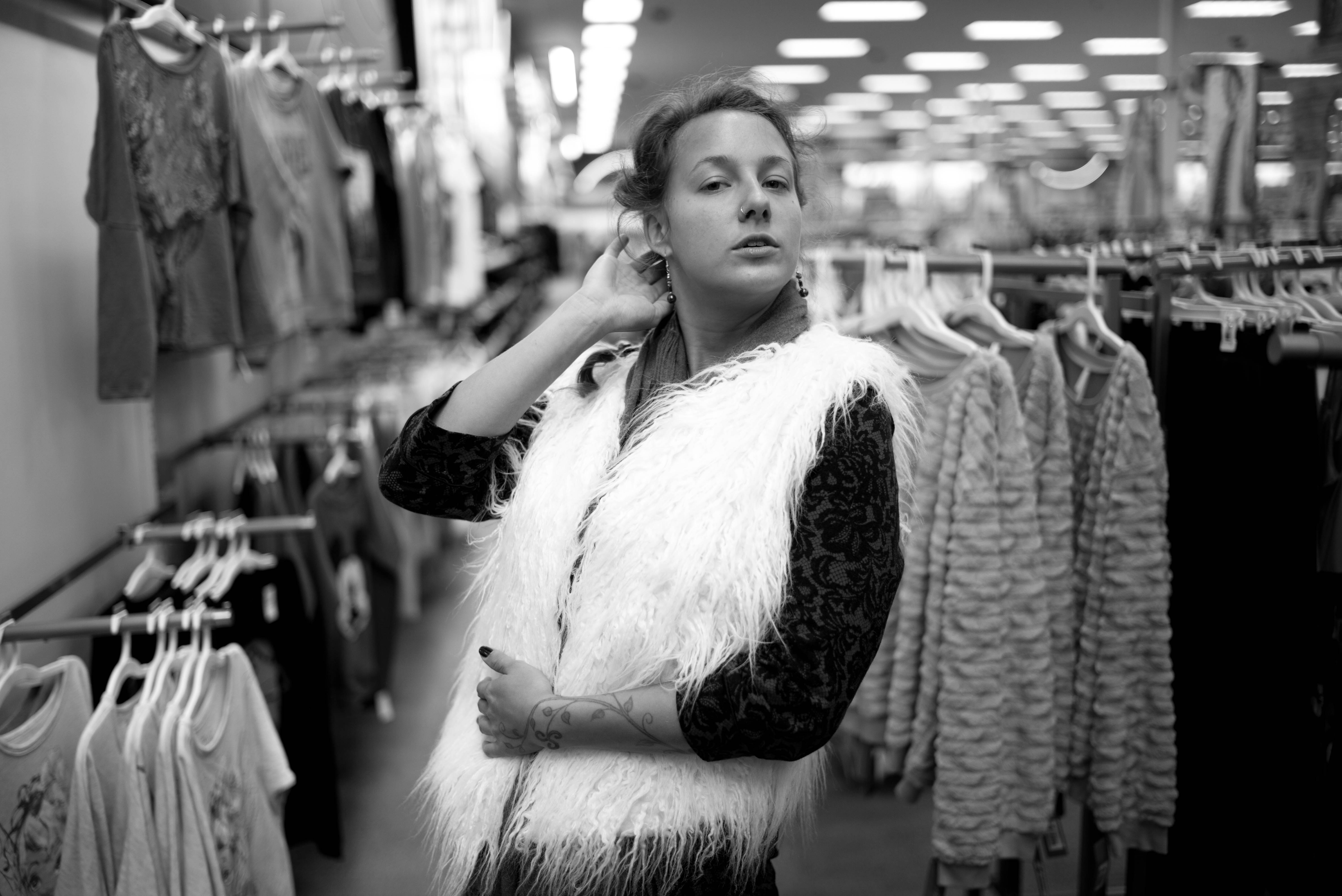 A striking portrait of a confident individual clad in a fluffy white vest, standing amidst a backdrop of hangers and clothing. The black and white palette enhances the subject's bold expression and the geometric lines of the store, creating a sense of modern elegance. Soft ambient lighting casts gentle highlights, drawing attention to the subject's poised demeanor and intricate tattoo details.