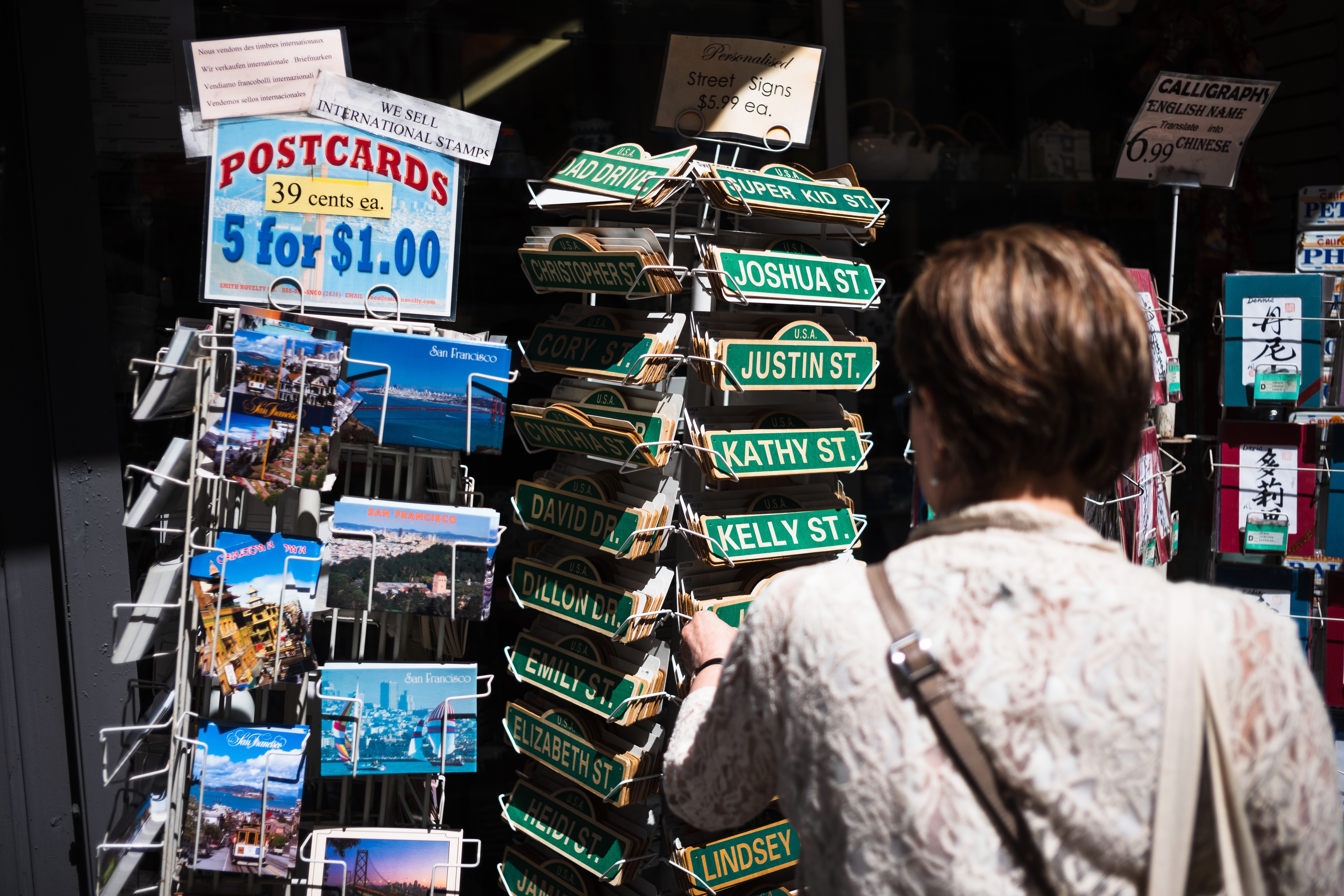 In a vibrant storefront, a woman peruses a selection of street sign replicas and postcards, embodying a sense of exploration. Bright daylight illuminates the scene, enhancing the colors of the displays and casting soft shadows. The composition draws the viewer's eye toward her engagement with the memorabilia, inviting a feeling of nostalgia and wanderlust.