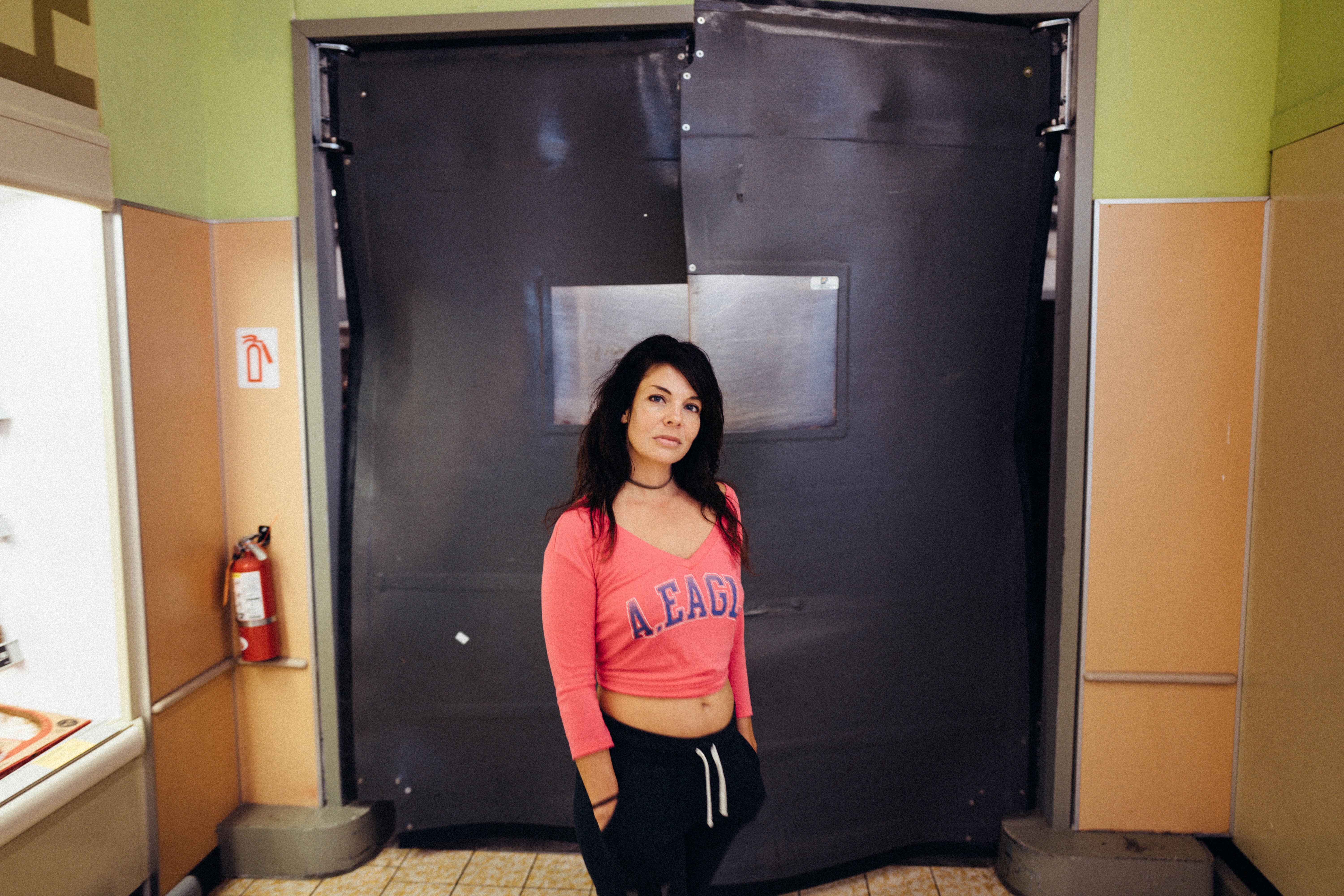 The photograph features a young woman standing confidently in front of a stark black door, exuding an air of resilience. The soft, diffused lighting highlights her relaxed pose, contrasting with the muted, institutional colors of the background that hint at an uninviting space. The composition draws the viewer's eye to her figure, creating a compelling narrative of isolation amidst an urban environment.