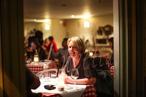 A woman sits at a dimly lit table, her warm smile radiating joy amidst the cozy restaurant atmosphere. The soft glow of candlelight reflects off glassware, while the red-checked tablecloth adds a charming, inviting touch. In the background, blurred figures create a lively ambiance, enhancing the overall sense of connection and celebration.