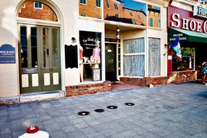 This photograph captures a quaint streetscape featuring two storefronts, each with distinct character. The warm sunlight bathes the scene, accentuating the rich textures of brick and glass, while reflections hint at the vibrant life beyond. The inviting display of merchandise and signage creates a nostalgic charm, inviting passersby to explore further.