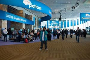 The photograph captures a bustling technology expo, with attendees engaging in conversation and networking under bright blue signage that emphasizes the event's focus on development. Soft, natural light streams in, enhancing the vibrant atmosphere while creating a sense of openness and innovation. The composition features a central figure in casual attire, adding a human element to the dynamic environment filled with professionals and displays.