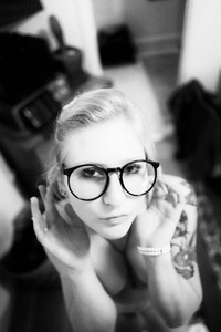 In this striking black and white portrait, a young woman with large, round glasses gazes directly at the viewer, exuding a blend of vulnerability and elegance. Her hands delicately frame her face, while soft light casts gentle shadows, enhancing her features and the intricate tattoos on her arms. The blurred background creates an intimate atmosphere, inviting the audience to connect with her thoughtful expression.