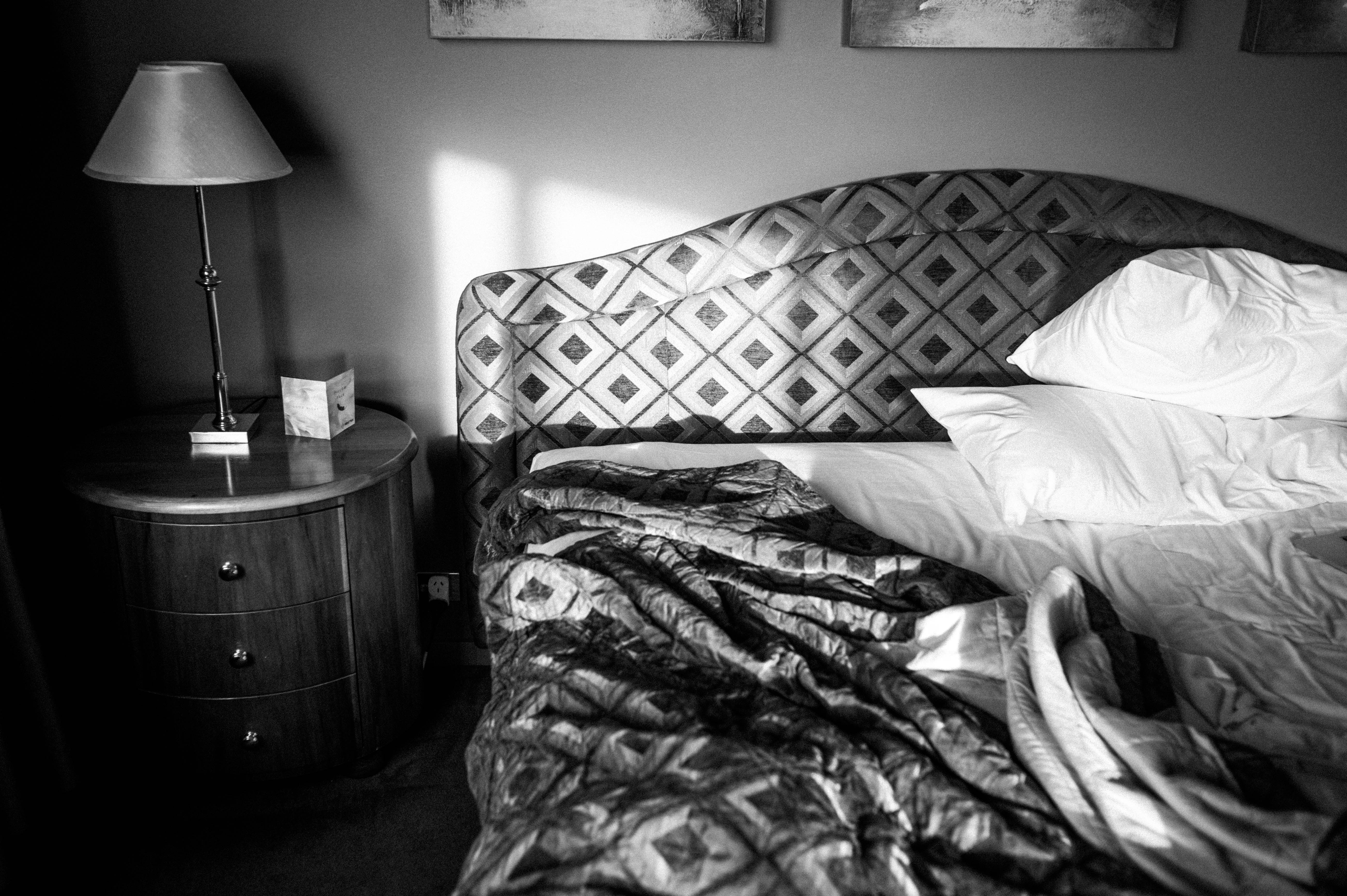 The photograph captures a serene hotel room in soft black and white, highlighting the rumpled bed with its unmade sheets and a patterned blanket flowing over the edge. Gentle sunlight filters through, casting a warm glow on the headboard and bedside lamp, fostering a mood of quiet introspection. The composition directs the viewer's gaze from the messy bed to the inviting nightstand, suggesting an intimate yet transient space of rest and respite.
