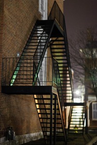 The photograph captures a striking spiral of black fire escapes set against a textured brick wall, illuminated subtly by green and white lights. The composition creates a sense of depth and intrigue, inviting the viewer’s gaze upward through the stark, industrial lines. The nighttime setting imbues the scene with a moody, almost haunting atmosphere, emphasizing the interplay of shadows and light.