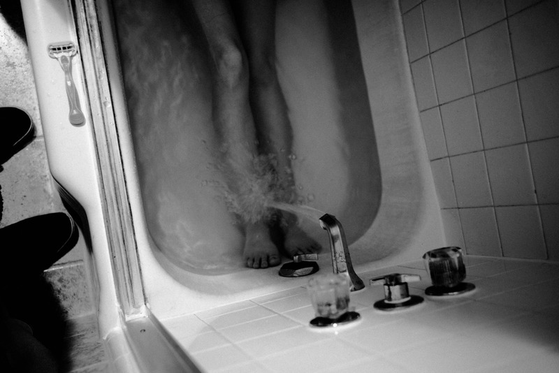In this intimate black-and-white photograph, a pair of legs submerged in water evoke a sense of calm and introspection. The play of light and shadow creates a moody atmosphere, while the contrasting textures of the water and tiles add depth to the composition. The slight ripple around the feet suggests movement, inviting the viewer to ponder the quiet moment captured in time.