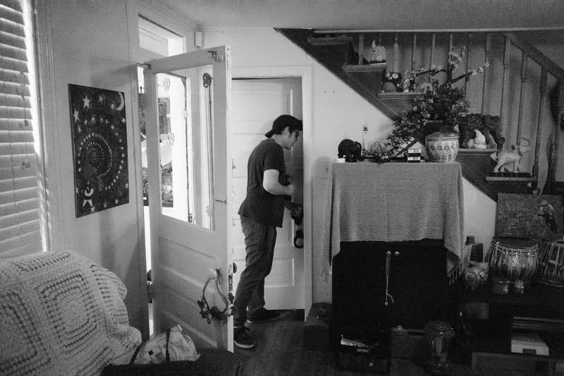 This black-and-white photograph captures a moment of quiet exploration within a cozy home interior. The subject, partially framed by the open door, embodies a sense of curiosity and intrigue, enhanced by the interplay of natural light spilling in from outside. The scattered details of the room, from artwork on the walls to eclectic decor, create a lived-in charm that invites viewers to ponder the stories held within these walls.