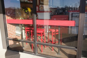 Inside a cozy firehouse-themed eatery, three bright red stools stand invitingly in front of a large window. The warm glow from the sunlight highlights the firefighter gear to the side, creating a vibrant contrast against the subdued brick backdrop. The composition balances the playful energy of the stools with the solemnity of the uniforms, evoking a sense of community and camaraderie.