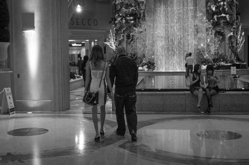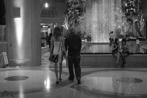 In a softly lit shopping corridor, a couple walks away from the camera, their leisurely pace suggesting a casual evening ambiance. The contrasting shadows and highlights enhance the intimate mood, while the background features a cascading waterfall, adding a serene yet vibrant atmosphere. Nearby, two women sit in contemplation, contributing to the underlying narrative of urban life and connection.