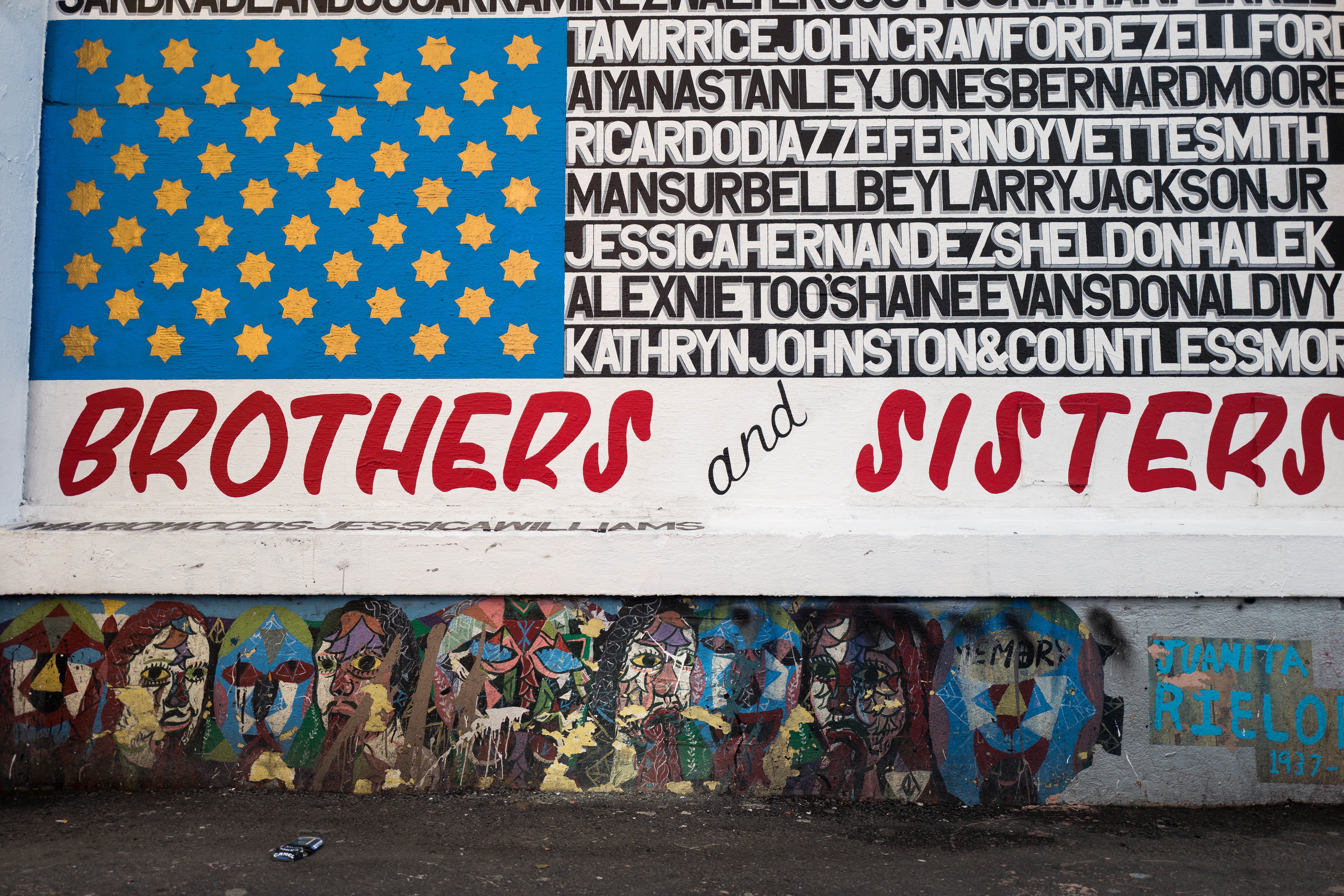 This vibrant mural celebrates community and resilience, featuring bold lettering that proclaims 'BROTHERS and SISTERS' against a backdrop of striking colors. The upper portion depicts a star-studded blue flag, while the lower section showcases a chaotic yet compelling array of faces, representing diversity and connection. The bright lighting enhances the energy of the piece, inviting viewers to reflect on unity amidst a rich tapestry of cultural identities.