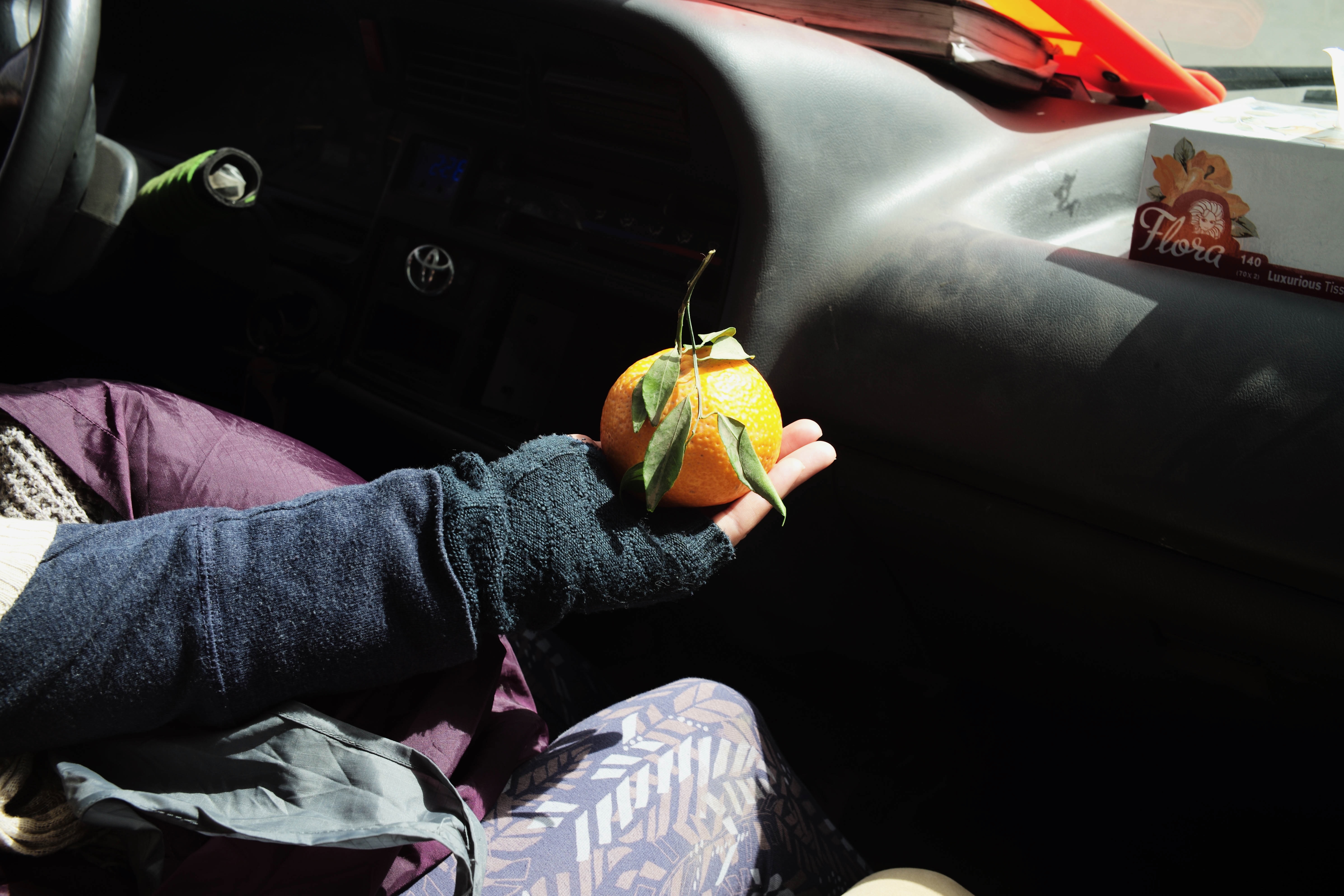 In a softly lit car interior, a hand with a fingerless glove cradles a vibrant orange, its leaves still fresh, symbolizing a moment of simplicity amid a busy day. The play of light catches the textured surface of the fruit while hints of cozy fabrics and car details create an intimate atmosphere. This juxtaposition of nature and everyday life evokes warmth and comfort.