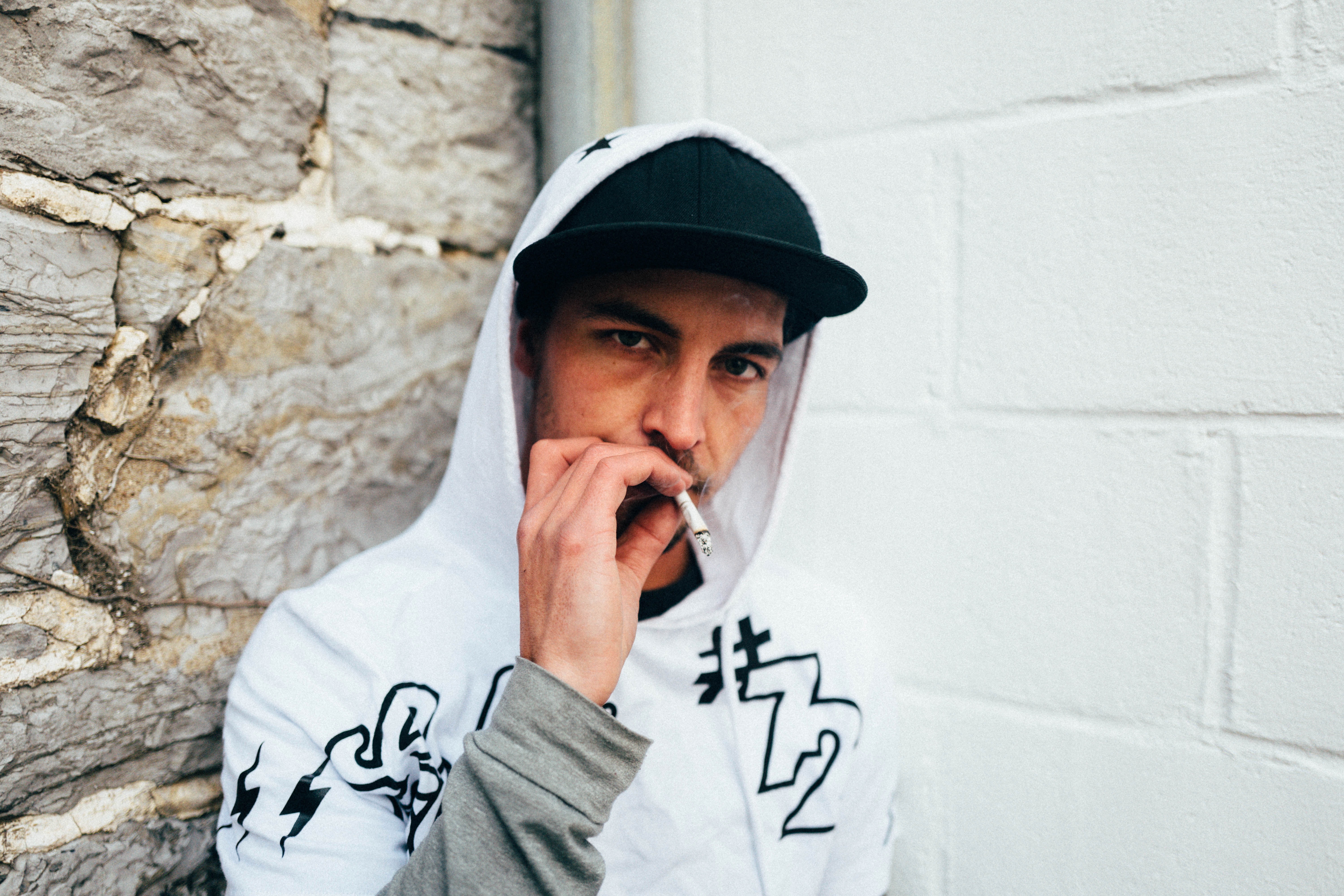 In this striking urban portrait, a young man leans against a textured stone wall, exuding a sense of cool detachment. The soft, diffused lighting highlights his features and creates a moody, introspective atmosphere as he ponders with a cigarette in hand. His casual attire and confident gaze suggest a relaxed yet rebellious spirit, inviting the viewer to contemplate his story.