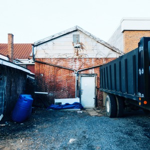 This photograph captures a rugged alleyway scene, dominated by a weathered brick building shrouded in creeping vines. The cool lighting casts a muted tone, enhancing the sense of abandonment and solitude, while the presence of the parked truck adds an industrial edge to the composition. The scattered debris evokes a narrative of decay and forgotten stories in an urban landscape.