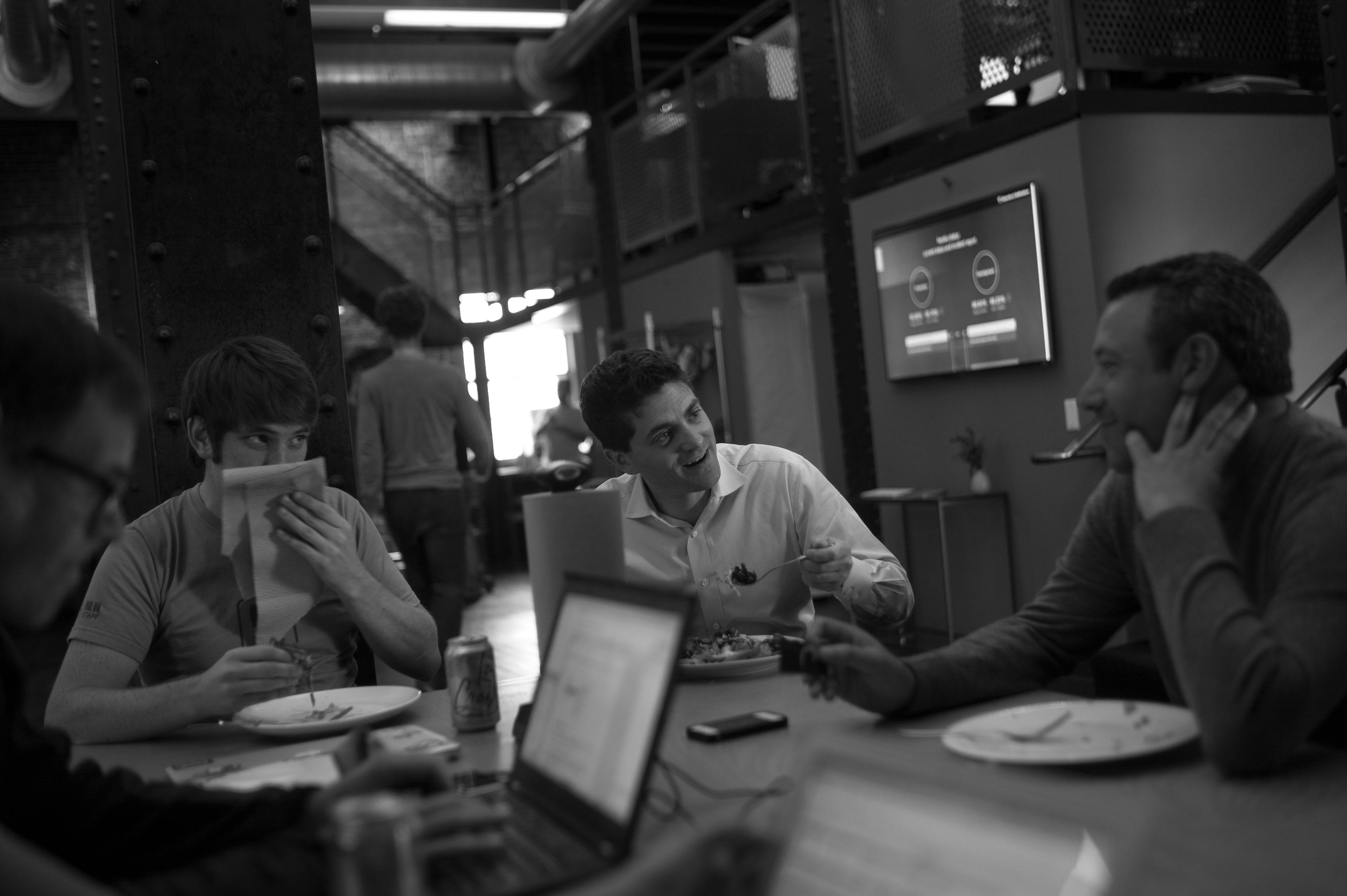 In a monochrome setting, a group of colleagues engages in a lively discussion over lunch, their plates and laptops sprinkled across a modern, industrial table. The mood is light and friendly, highlighted by the playful interaction of the individuals, particularly the laughter exchanged between two men. Soft, ambient light filters through the workspace, creating a warm yet professional atmosphere that complements the casual camaraderie.