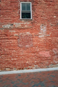 This photograph captures a weathered red brick wall, dominated by its rough textures and subtle color variations. A solitary window features a small plant, hinting at life amidst the starkness, while the combination of soft natural light and hard surfaces creates a contemplative mood. The neatly arranged herringbone pavement below contrasts with the wall's ruggedness, enhancing the composition's balance.