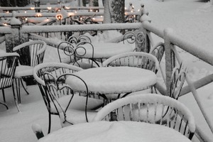 The photograph captures a tranquil outdoor café blanketed in fresh snow, where delicate iron tables and chairs sit silently beneath a thick layer of white. Soft, muted lighting creates a serene and almost dreamlike atmosphere, punctuated by the gentle glow of distant lanterns. The composition invites a sense of stillness, evoking the quiet beauty of winter's embrace.