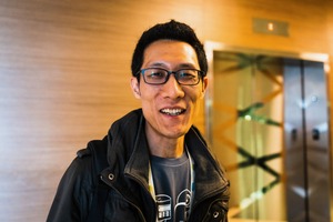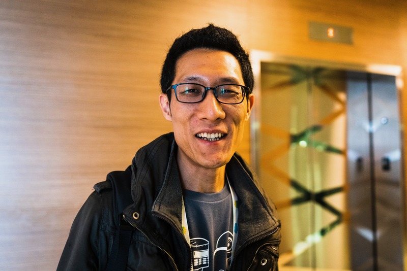 A young man stands smiling brightly, exuding warmth and friendliness. The ambient glow from the softly lit lobby highlights his features, while the modern backdrop of an elevator hints at a bustling environment. His casual attire and approachable demeanor suggest a laid-back yet engaging atmosphere, inviting connection.