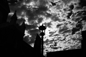 The photograph captures a dramatic interplay of shadows and clouds, featuring a street lamp and building silhouettes against a tumultuous sky. The black and white palette evokes a sense of mystery and drama, emphasizing the intricate shapes of the architecture and the ethereal quality of the clouds. The strong contrast between light and dark creates an atmospheric tension, inviting contemplation and intrigue.
