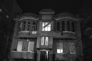 Bathed in shadows and moonlight, the aged building stands with an air of mystery, its once vibrant façade now dulled and peeling. Dimly lit windows hint at a bygone era, while the stark black and white composition enhances the sense of nostalgia and solitude. The surrounding darkness amplifies the quiet desolation, inviting curiosity about the stories within.