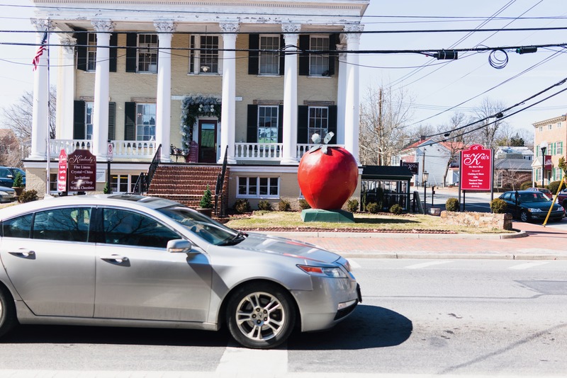 This photograph captures a charming building with classic architecture, marked by grand columns and greenery, exuding a sense of history. In the foreground, a shiny silver car glides past, while a whimsical giant tomato sculpture stands proudly in the yard, adding a playful touch to the scene. The bright natural light enhances the cheerful atmosphere, inviting viewers to appreciate the blend of elegance and whimsy in the composition.