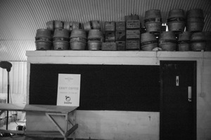 In this black-and-white photograph, a rustic corner of a coffee shop is depicted, featuring a stark contrast between the weathered wooden crates and the sleek, modern signage advertising 'craft coffee.' The composition is balanced, with warm textures offsetting the coolness of the dark wall, while soft ambient lighting creates a cozy yet industrial atmosphere.