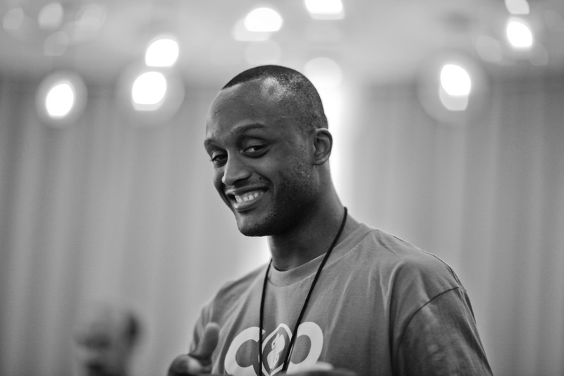 The photograph captures a moment of genuine warmth as a man flashes a confident smile, exuding a playful charm. Set against a softly blurred backdrop with striking light orbs, the black-and-white composition emphasizes the subject’s joyful expression and relaxed demeanor. The overall mood is inviting and light-hearted, inviting viewers to share in the moment of connection.