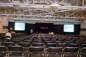 The photograph captures a large, empty auditorium, with rows of black chairs arranged neatly, evoking a sense of expectation. Soft, diffused lighting illuminates the space, highlighting the minimalist decor and the bold hashtag on stage, suggesting an upcoming event. The overall mood is one of quiet anticipation, as a few attendees move about, preparing for a gathering that promises to fill the room with energy.