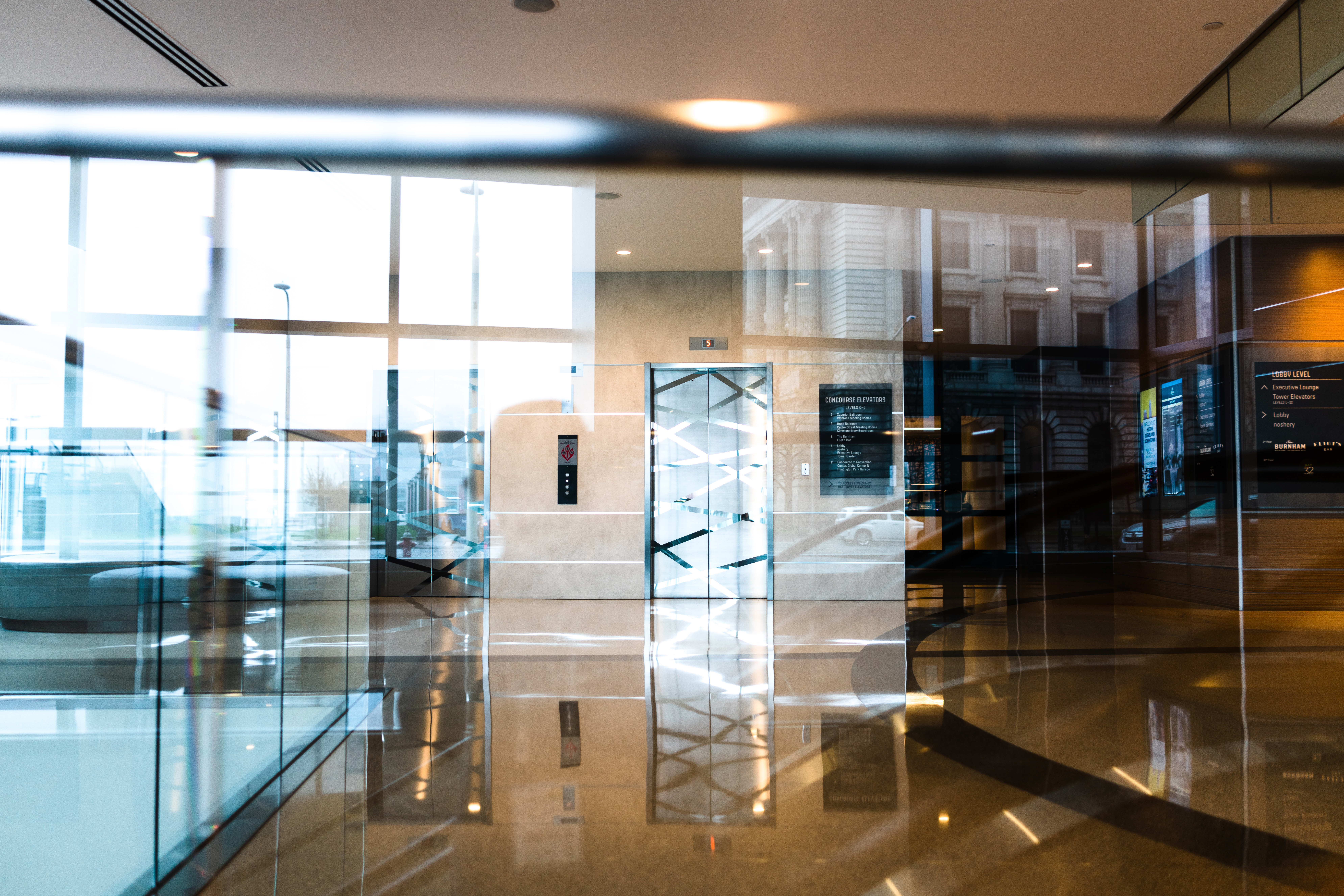 The photograph captures a modern, minimalist lobby bathed in natural light, highlighting the interplay of reflections on polished surfaces. The sleek elevator doors serve as a focal point amidst the transparent glass and clean lines, creating an atmosphere of calm sophistication. The muted tones and soft brightness contribute to a serene and inviting mood, emphasizing the architectural beauty of the space.