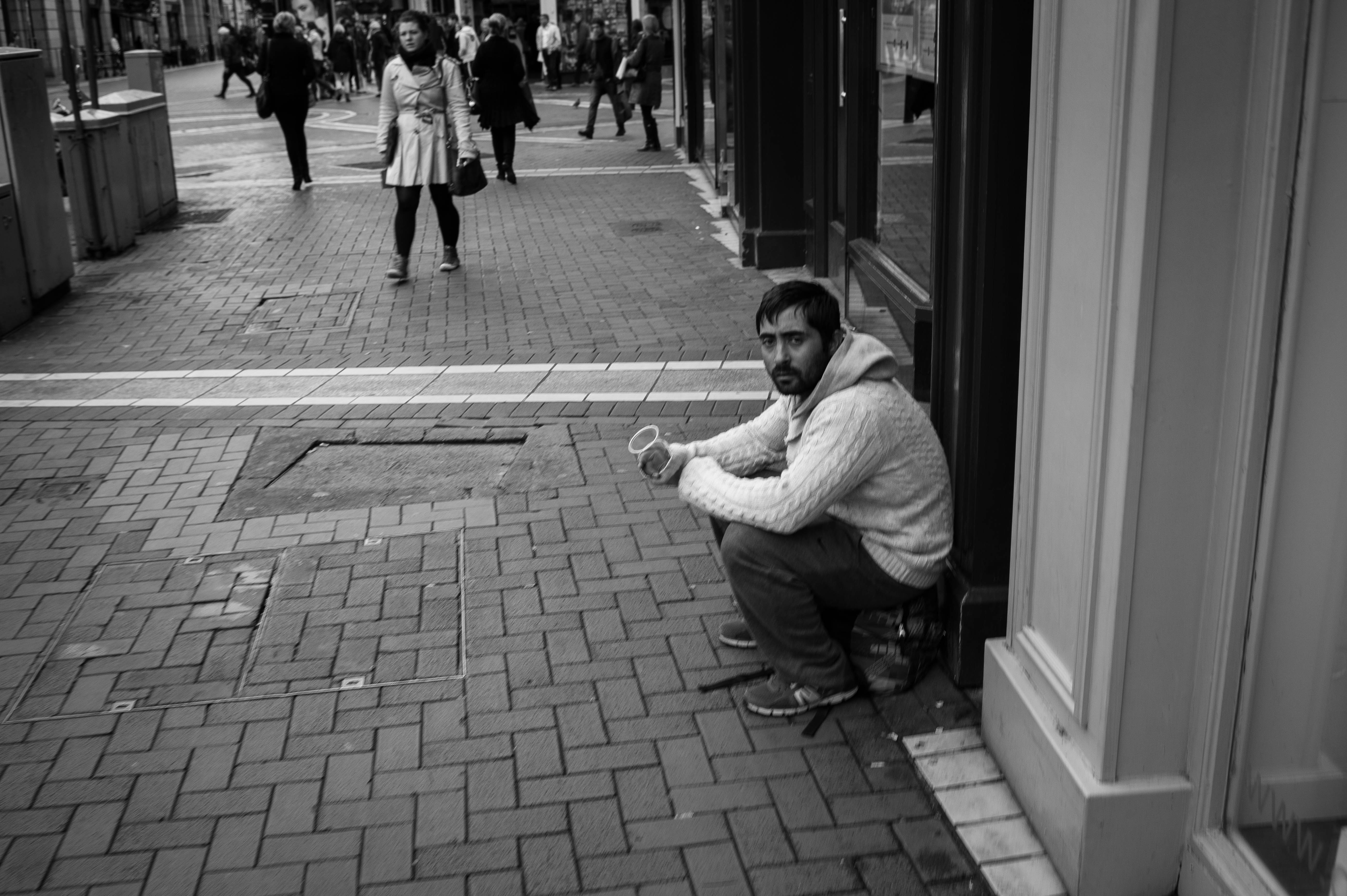 In the bustling street, a solitary figure sits against a wall, his expression one of vulnerability amidst the urban crowd. The black-and-white composition emphasizes the stark contrast between his stillness and the movement of passersby, capturing a poignant moment of isolation. Soft natural light illuminates his face, highlighting the weariness that tells a deeper story of hardship.