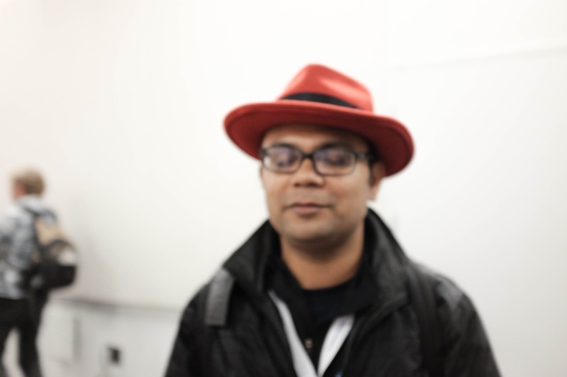 The photograph captures a figure in a striking red hat, framed against a blurred background that suggests movement and activity. The soft lighting adds an air of intrigue, while the focused expression of the subject invites curiosity. This interplay of clarity and blur creates a dynamic mood, feeling both vibrant and spontaneous.