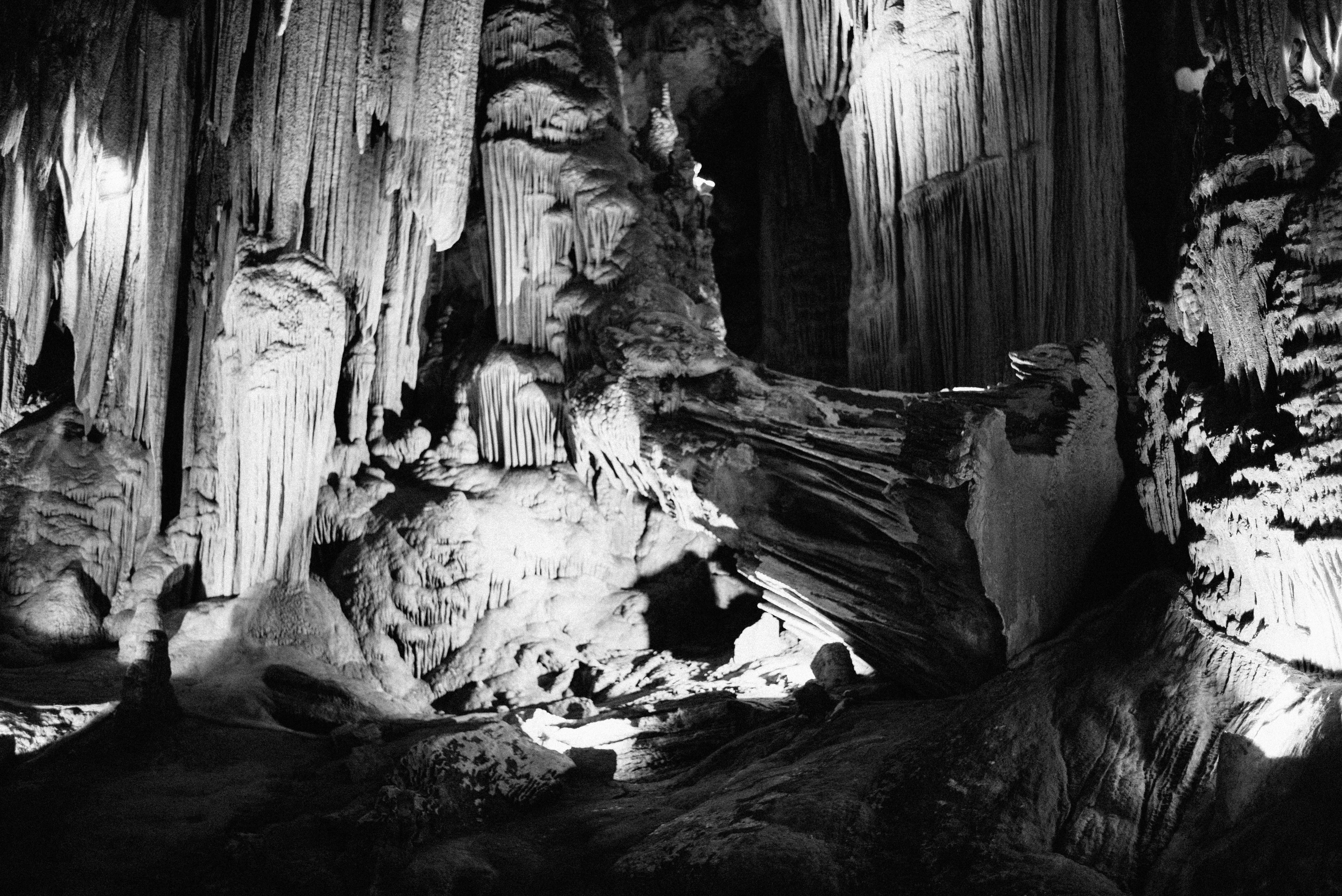 An enigmatic cavern unfolds, adorned with majestic stalactites and shadows that dance along the textured stone. The interplay of dim lighting highlights the intricate formations, evoking a sense of mystery and timelessness. The monochrome palette enhances the otherworldly atmosphere, drawing the viewer deeper into this subterranean realm.