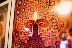 This vivid artwork captures two faces converging in an intricate tapestry of swirling colors and concentric patterns. The vibrant oranges and deep blues evoke a surreal, almost psychedelic atmosphere, drawing the viewer into a mesmerizing stare between the subjects. Soft lighting glints off the surface, adding depth and highlighting the uncanny details of the design.