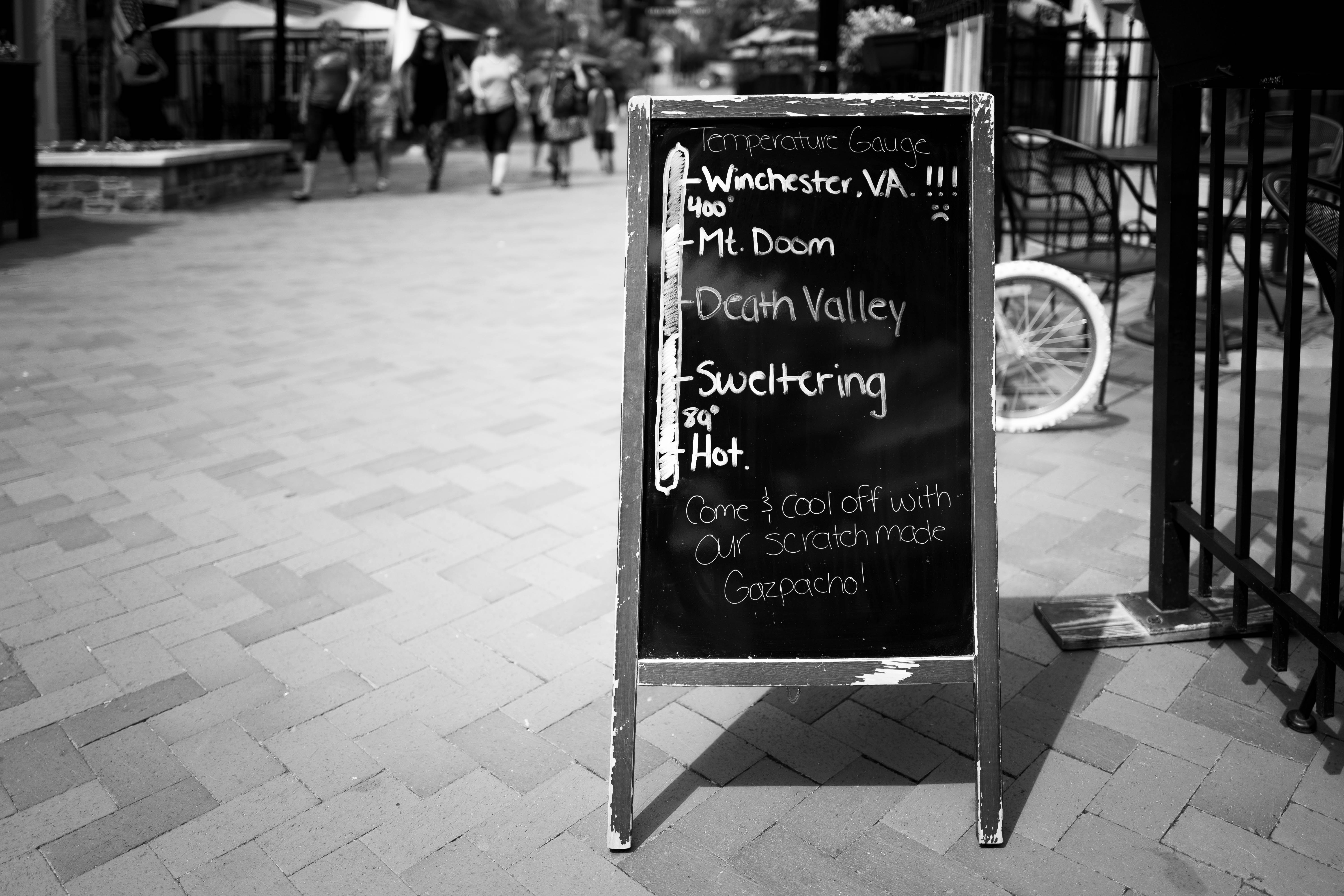 A playful chalkboard sign stands on a bustling pathway, creatively measuring temperatures with a humorous twist. The bold white lettering contrasts sharply against the dark background, while pedestrians stroll in the background, hinting at a warm day. The black-and-white composition adds a timeless feel, emphasizing the relaxed, inviting atmosphere of a casual eatery.