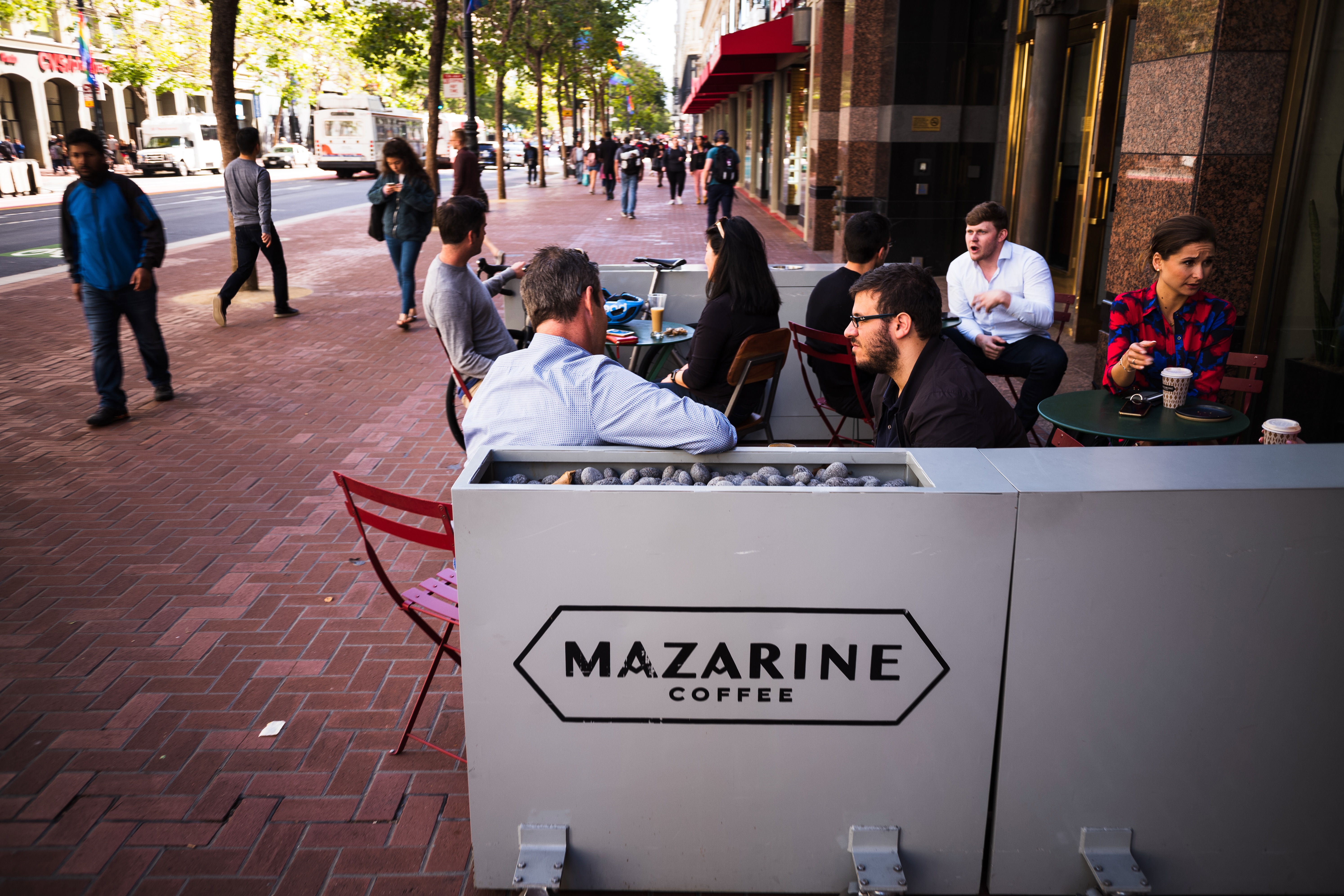 A vibrant street scene captures a variety of people conversing and enjoying their drinks outside Mazarine Coffee. The warm sunlight filters through the trees, creating a relaxed and inviting atmosphere, while the mix of casual attire adds to the urban feel. This setting reflects the lively energy of city life, punctuated by the laughter and chatter of patrons indulging in coffee culture.