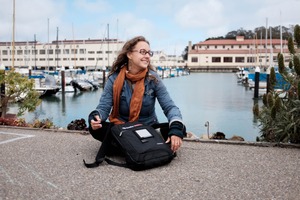 The photograph captures a young woman seated casually at a marina, her joyful expression radiating contentment against a backdrop of boats and a serene waterfront. Soft, natural light enhances the scene, creating a peaceful, inviting atmosphere. The composition draws the eye to the subject while framing her within the tranquil setting, emphasizing a moment of relaxation and connection with nature.