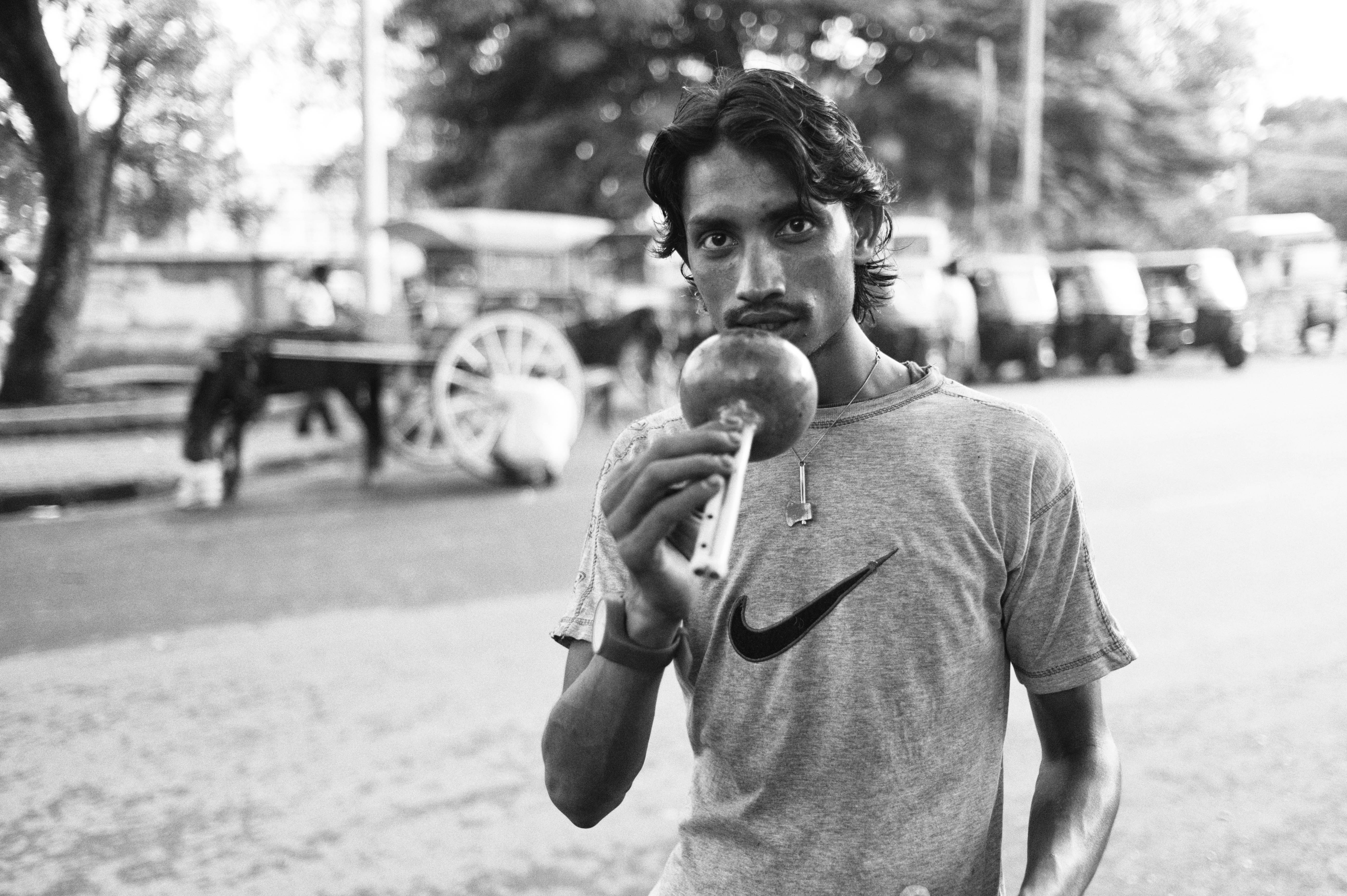 In this black-and-white photograph, a young man with expressive eyes holds a spherical object, exuding a sense of confidence and curiosity. The soft light filters through the trees in the background, enhancing the candid atmosphere of a bustling urban street. The contrast between his focused gaze and the blurred activity around him creates a striking focal point, inviting viewers into his world.