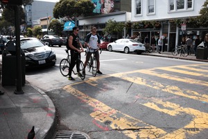 The photograph captures two cyclists paused at a bustling street corner, embodying a sense of anticipation and camaraderie. Bright, natural lighting bathes the scene, highlighting the vibrant street life and colorful storefronts in the background. The diagonal lines of the yellow crosswalk draw the viewer's eye towards the intersection, enhancing the dynamic urban atmosphere.