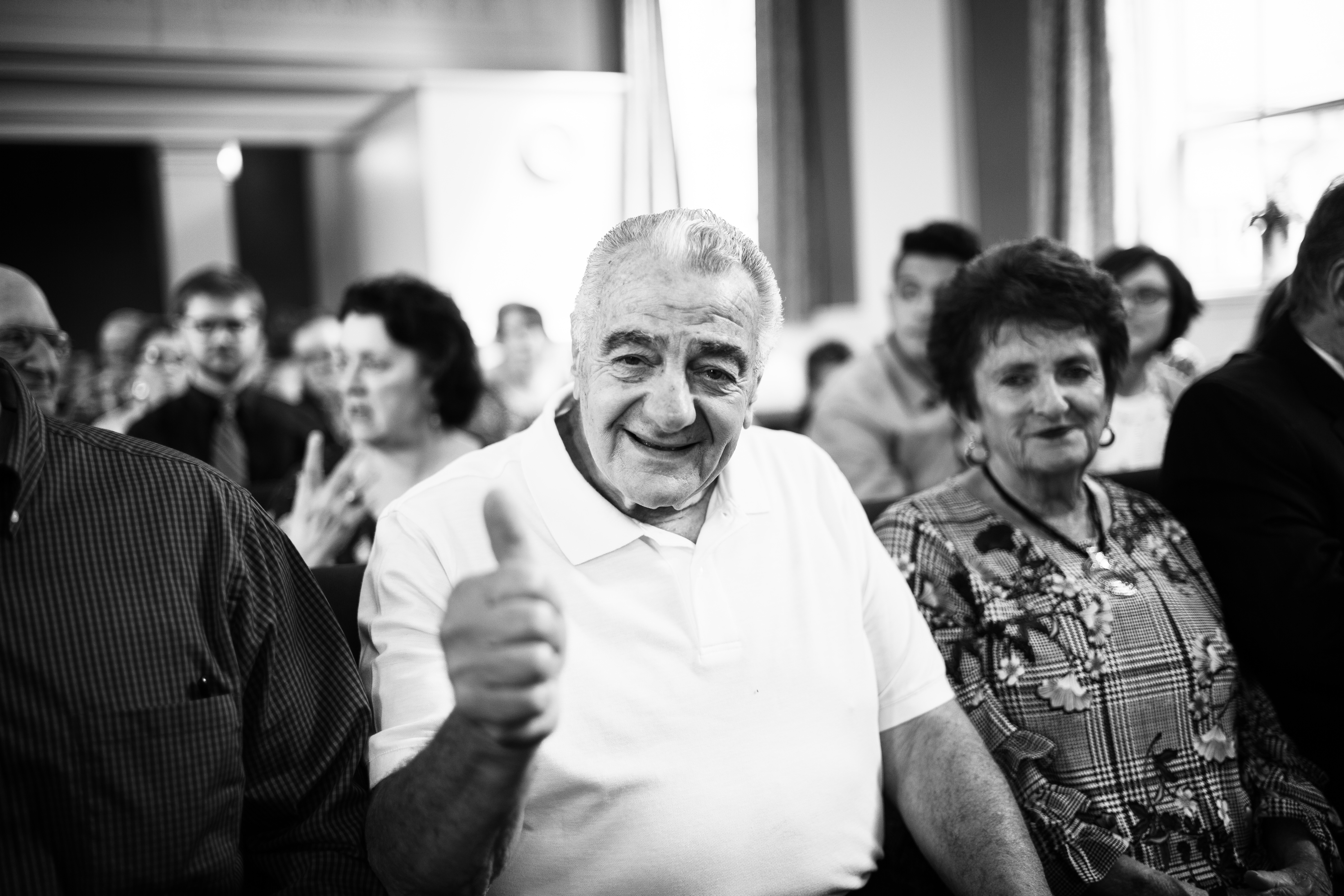 In a candid gathering, an older man smiles broadly, giving a thumbs-up to the camera, radiating warmth and positivity. The black-and-white composition highlights the contrast between his cheerful expression and the more subdued, contemplative faces surrounding him. Soft natural light filters in from a window, enhancing the sense of camaraderie and joy in the atmosphere.