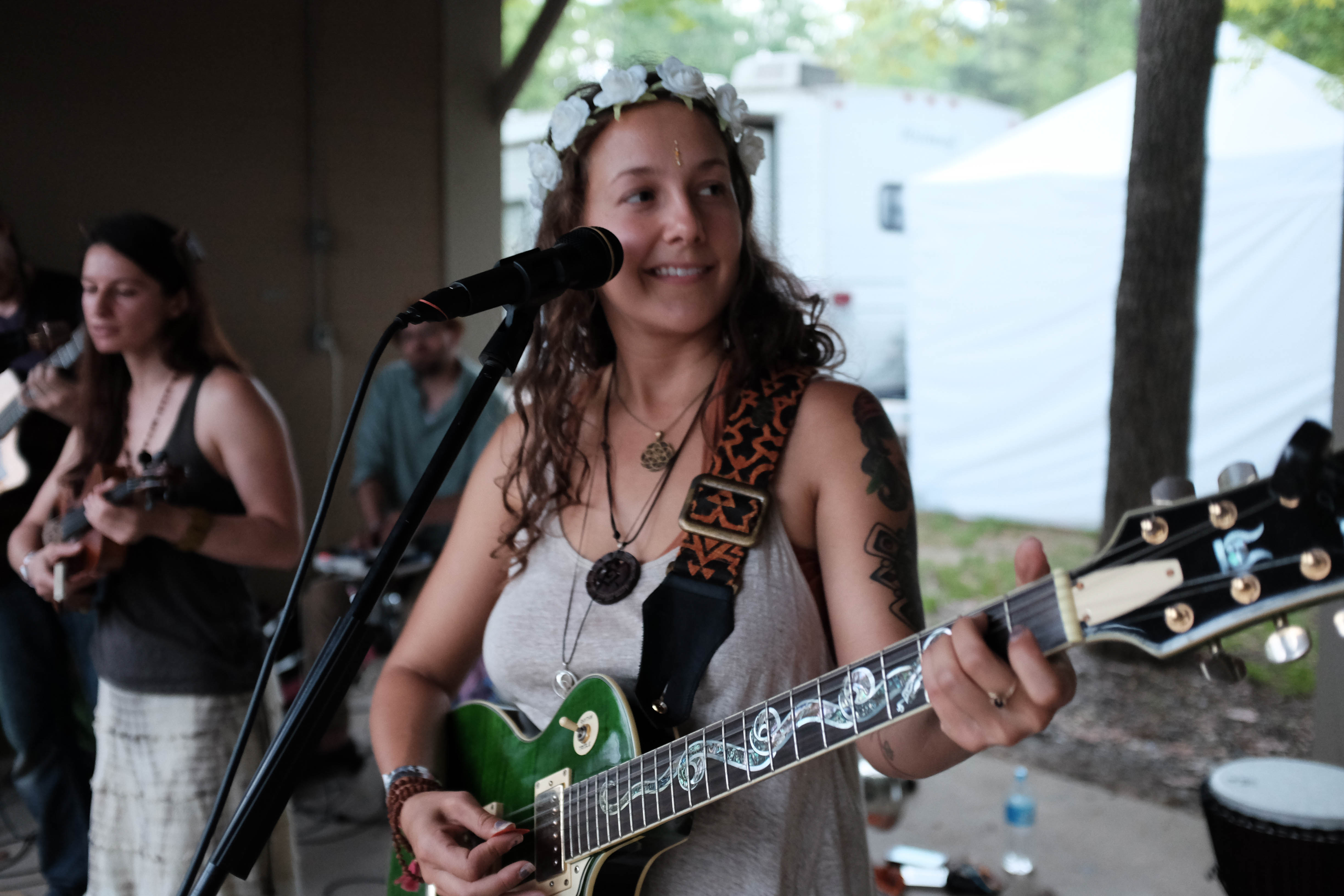 In a lively outdoor setting, a woman with a flower crown strums a vibrant green guitar while smiling at the audience, embodying joy and connection. Soft, natural light filters through the trees, creating an intimate atmosphere as fellow musicians play in the background, enhancing the sense of camaraderie. The composition captures a moment of musical magic, underscored by the relaxed, earthy vibe of the scene.
