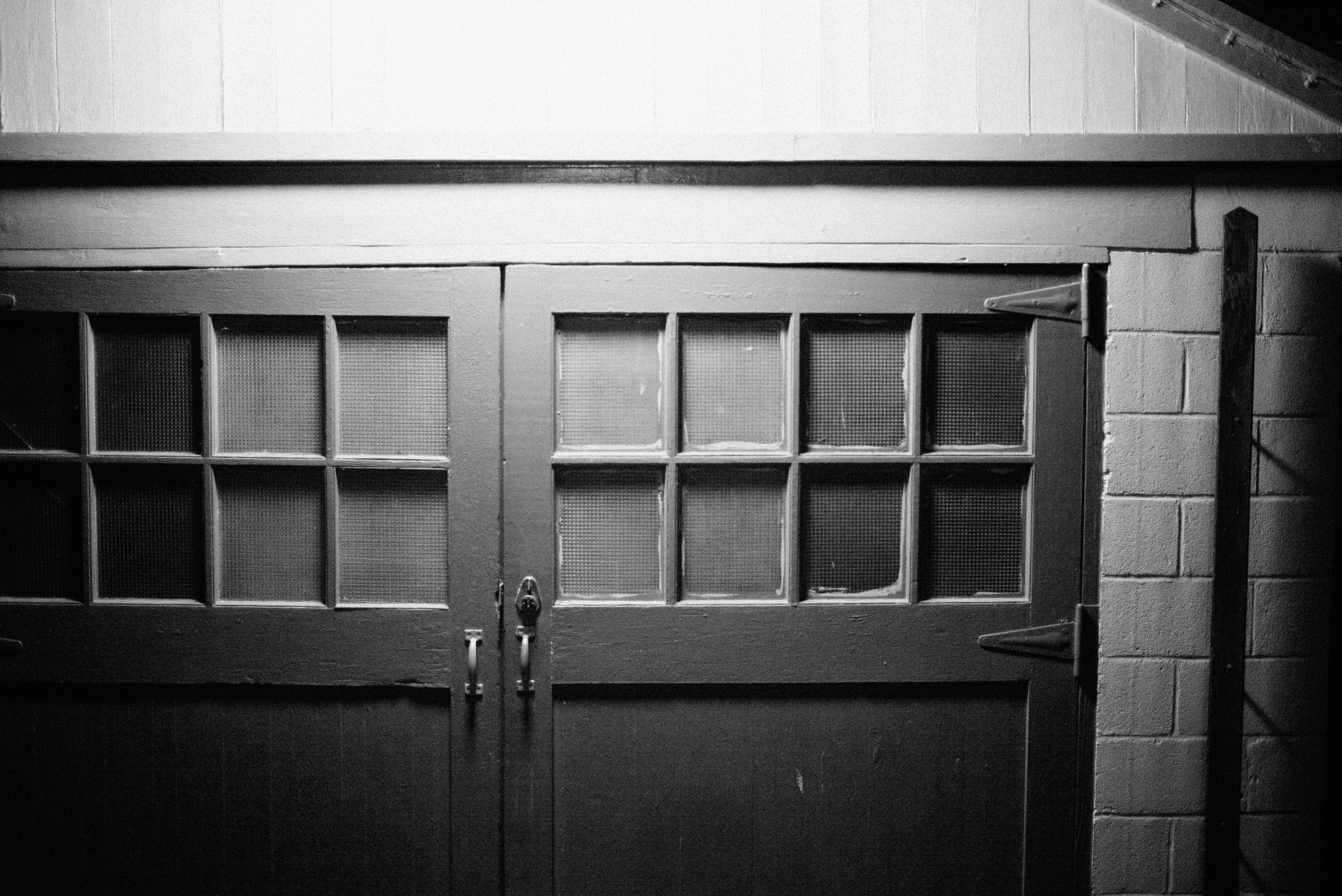 The photograph captures a pair of rustic double doors, shrouded in deep shadows and illuminated by a stark overhead light. The contrast between the soft, subtle details of the wood and the harsh glare above creates an atmosphere of mystery and quiet tension. This intimate composition invites the viewer to ponder what lies beyond, evoking a sense of nostalgia and contemplation.