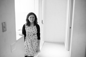 A young woman stands in a softly lit corridor, exuding a sense of quiet confidence and warmth. Dressed in a floral dress, she contrasts beautifully with the minimalist, monochromatic background, which enhances the serene atmosphere. The gentle play of light creates a calm, inviting mood, drawing the viewer into her intimate space.