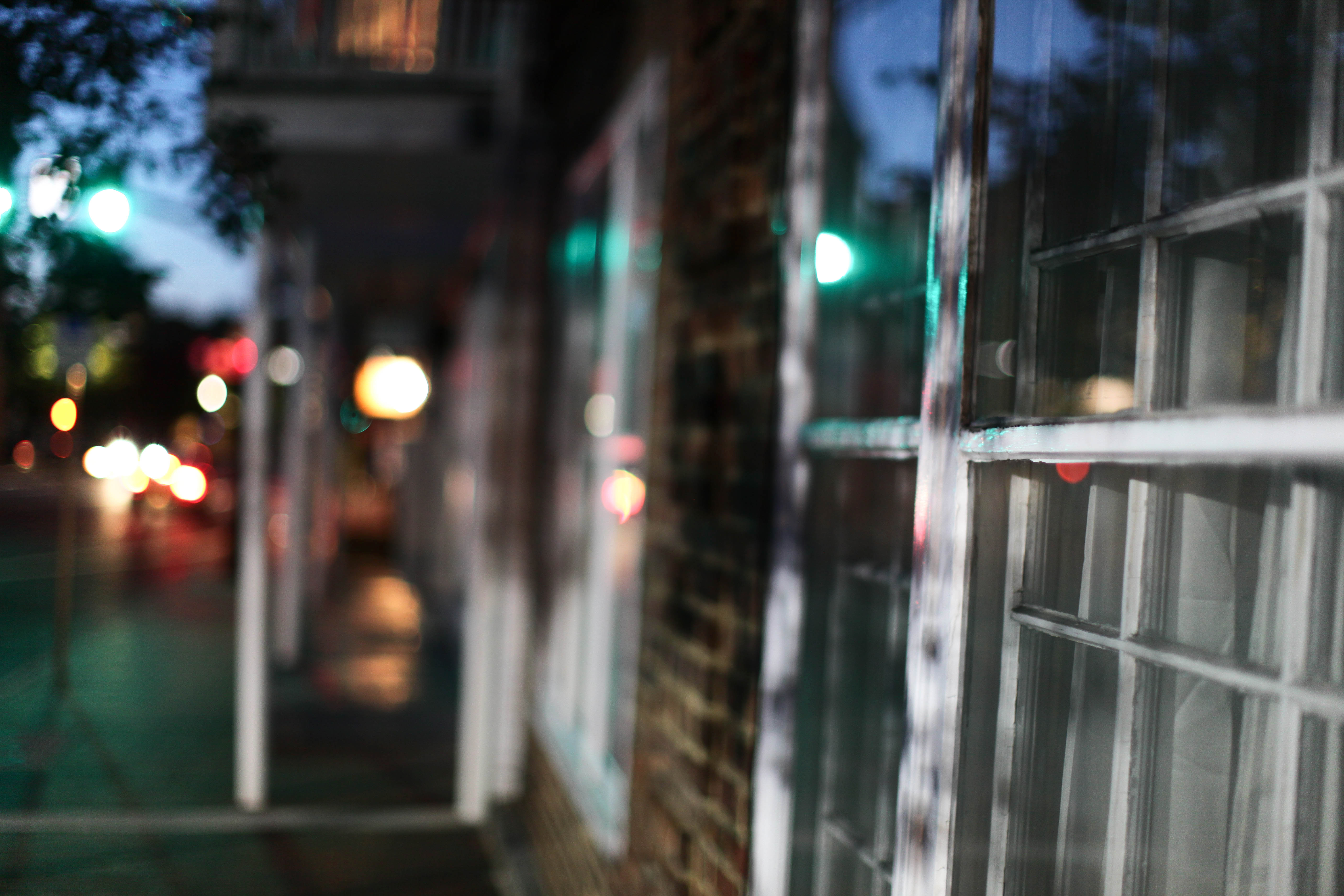 The photograph captures a dimly lit street scene at twilight, where soft reflections dance on the glass of nearby windows. The blur adds a dreamy quality, evoking a sense of nostalgia and quiet intrigue. Subtle pops of color from distant streetlights create a gentle contrast against the muted tones of the brick facade, enhancing the tranquil mood.
