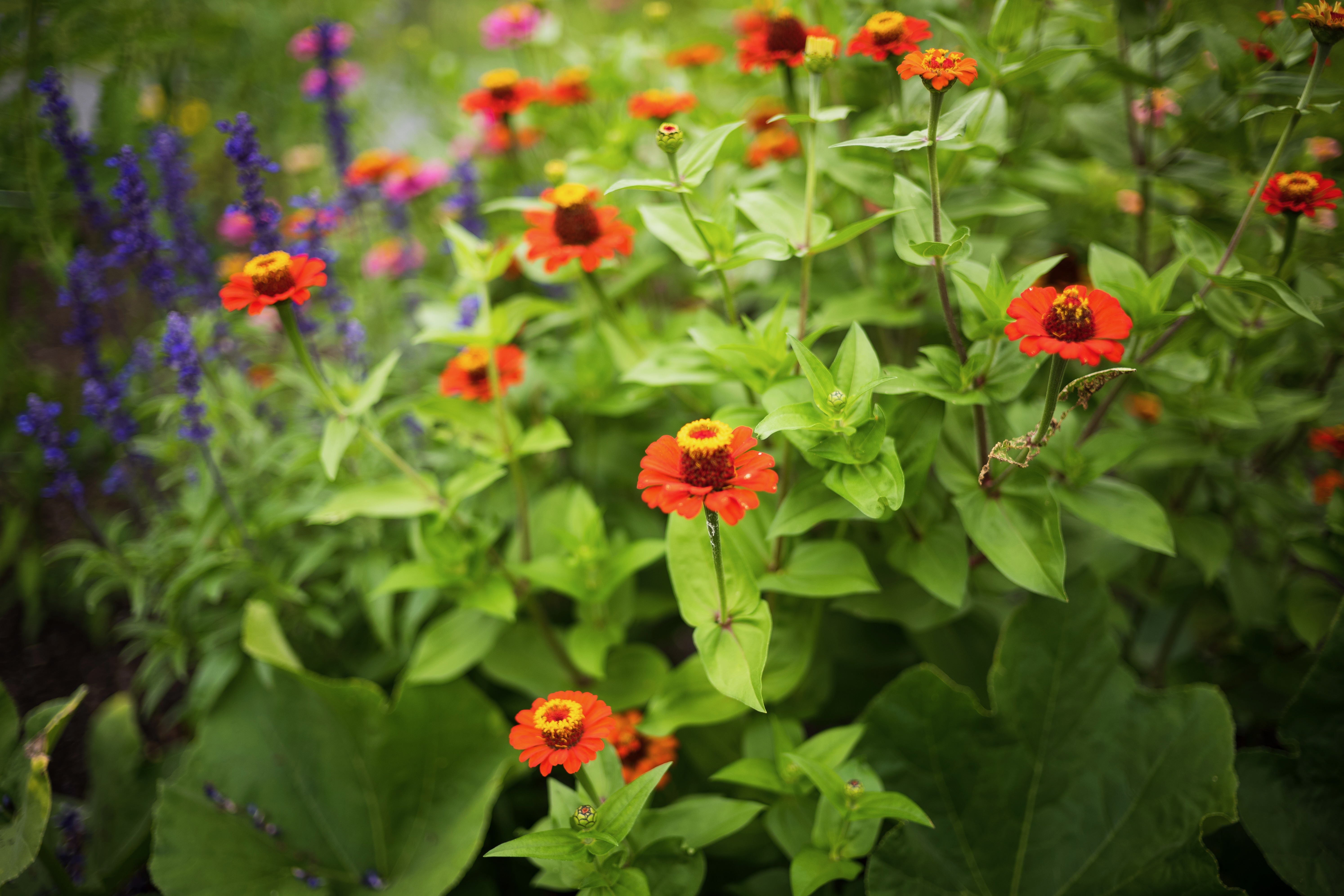 A lush arrangement of red and purple flowers creates a vivid tapestry of color, bringing life to the garden scene. The soft, diffused lighting accentuates the rich hues and gentle textures of the petals, evoking a serene and joyful atmosphere. The composition invites the viewer to immerse themselves in nature's beauty, celebrating the vibrancy of blooming life.