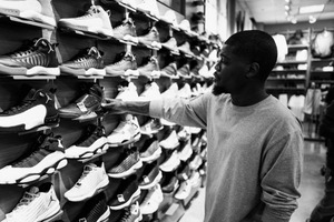 In this striking black-and-white photograph, a young man thoughtfully examines a row of sneakers in a vibrant store. The intricate layout of shoes creates a visually dynamic backdrop, while the soft lighting highlights the subject's contemplative expression, evoking a sense of anticipation and personal connection to the choice at hand.